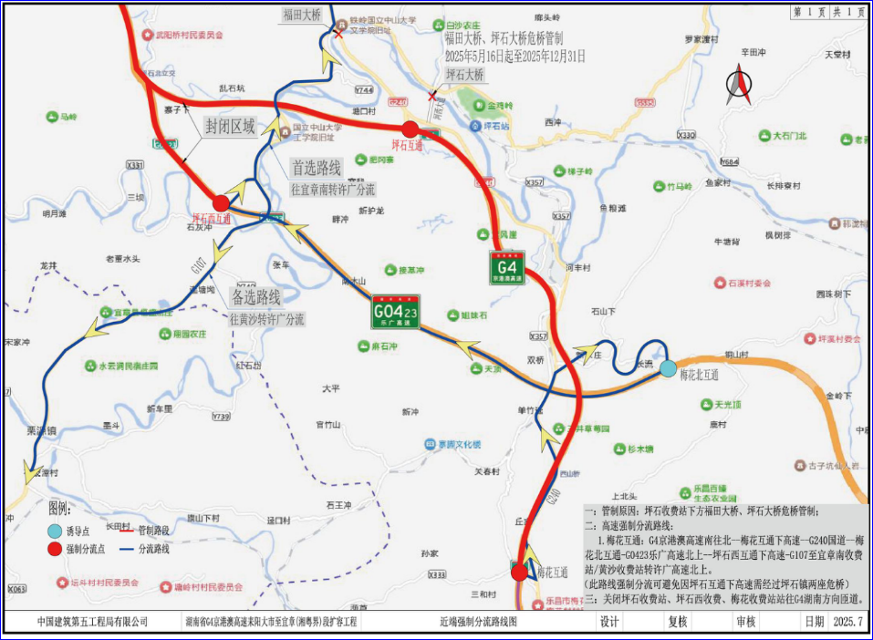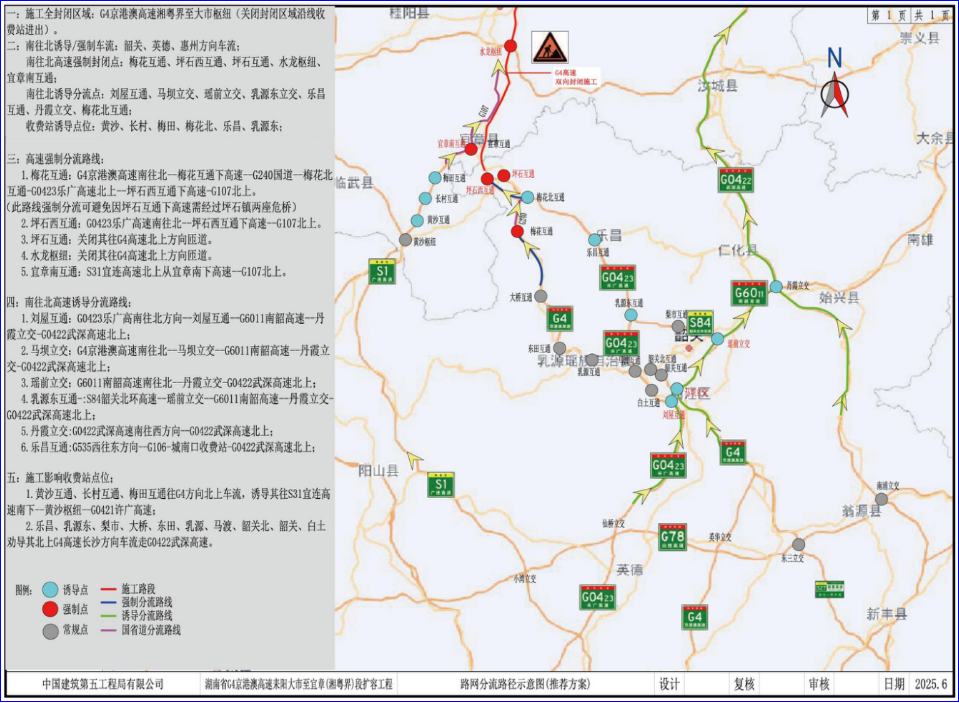 1、G4京港澳高速北上湖南车流在梅花互通分流下高速走G240至梅花北互通上G0423乐广高速北上。
